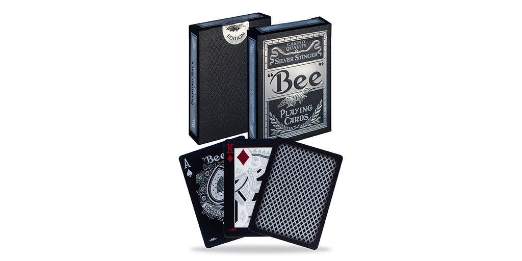 Shine at the card table with the Bee Silver Stinger Playing Cards—a stunning, limited edition deck combining the legendary Bee casino quality with dazzling modern style. Each deck features the iconic Stinger back design, now brought to life in bold black with glimmering silver inks for a sleek, contemporary twist.