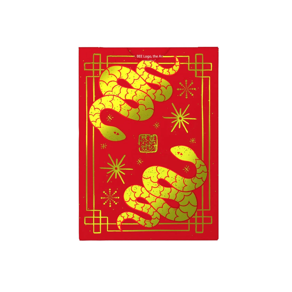The tuck box is the first thing that grabs attention, featuring metallic-style gold snake artwork on a rich red background with geometric border accents, starburst motifs, and celebratory details including Gong Xi Fa Cai. The front design prominently pairs the Bee logo with Year of the Snake branding, giving the deck a seasonal and collectible identity that feels ideal for Lunar New Year celebrations, display, and gifting.