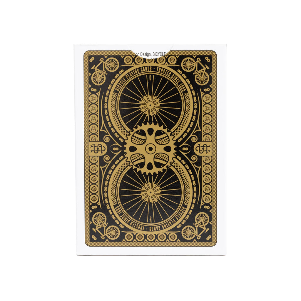 The tuck case is a piece of art unto itself—adorned with shimmering gold foil details, embossed linework, and period-style typography reminiscent of late 19th-century design. Inside, each card features bespoke hand-drawn faces and back designs, inspired by the industrial elegance of the original United States Playing Card Company era. The back design is rich with Victorian gear motifs, decorative frames, and circular bicycle imagery, representing both artistry and America’s age of progress.