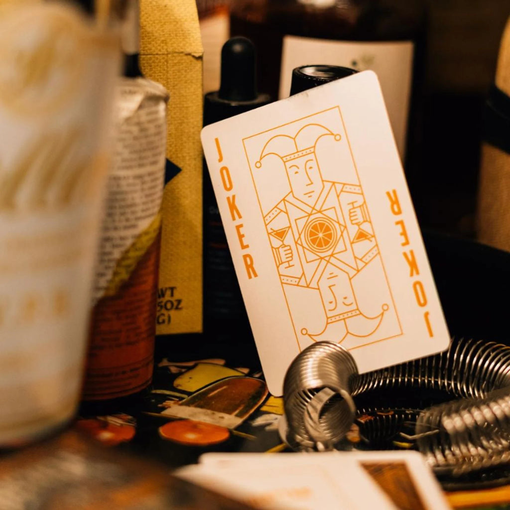 The tuck box is printed on matte black stock and dressed in art‑deco copper and silver foil, echoing the golden age of cocktails and adding bar‑cart‑worthy shine to your collection. Inside, the card design continues the theme with clean recipe layouts, minimalist line art of glassware, and custom Jokers that double as bar companions.