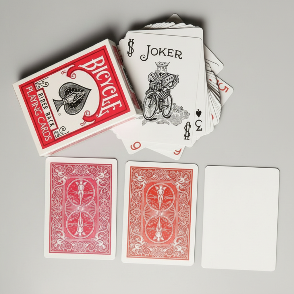 Faces are standard Bicycle 808: traditional indices, pips, and court cards in the usual red and black color scheme, plus the familiar Bicycle Ace of Spades and a classic black-and-white Joker. That makes the deck instantly readable for laypeople and ideal for magic, practice, and casual play.