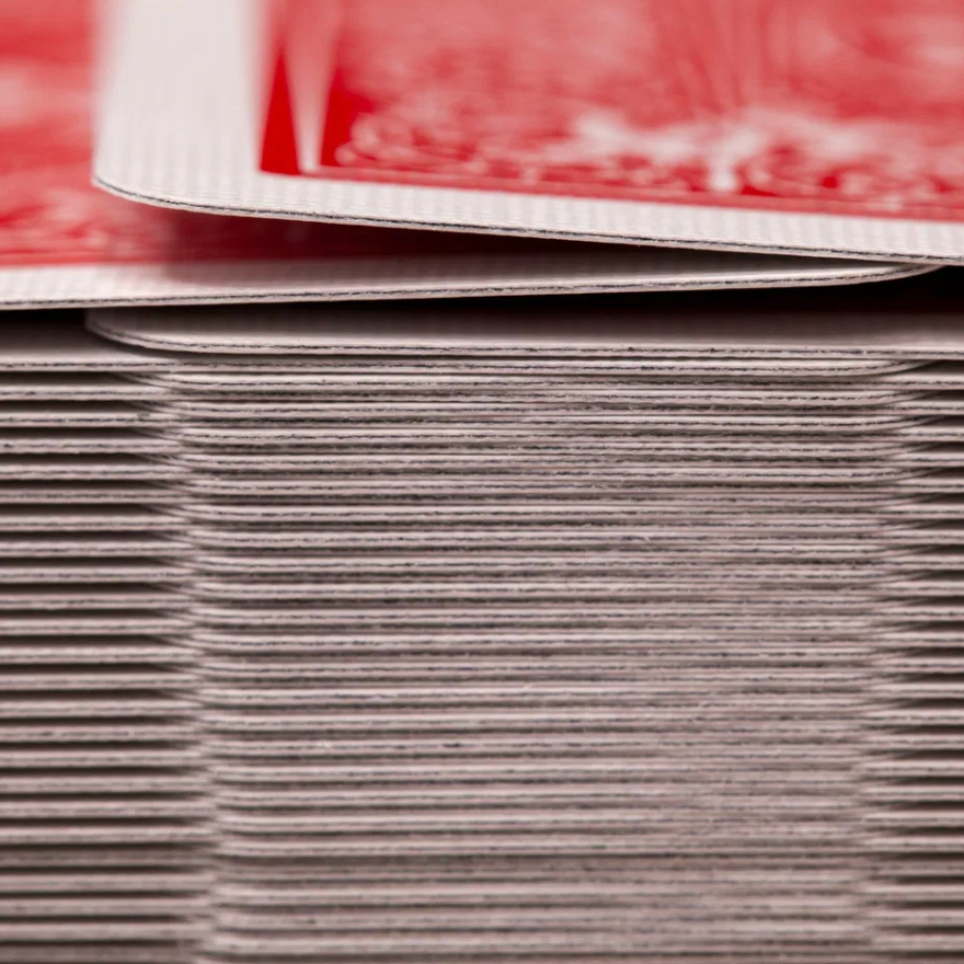 Every deck in the brick is traditionally cut, with the blade entering from the faces and exiting through the backs. This classic cut allows the edges to interlace perfectly, making table and in‑the‑hands faro shuffles, riffles, and strip shuffles smoother and more reliable than with modern‑cut Bicycle decks—one of the main reasons card magicians and gambling experts favor Gold Standards as everyday workers.