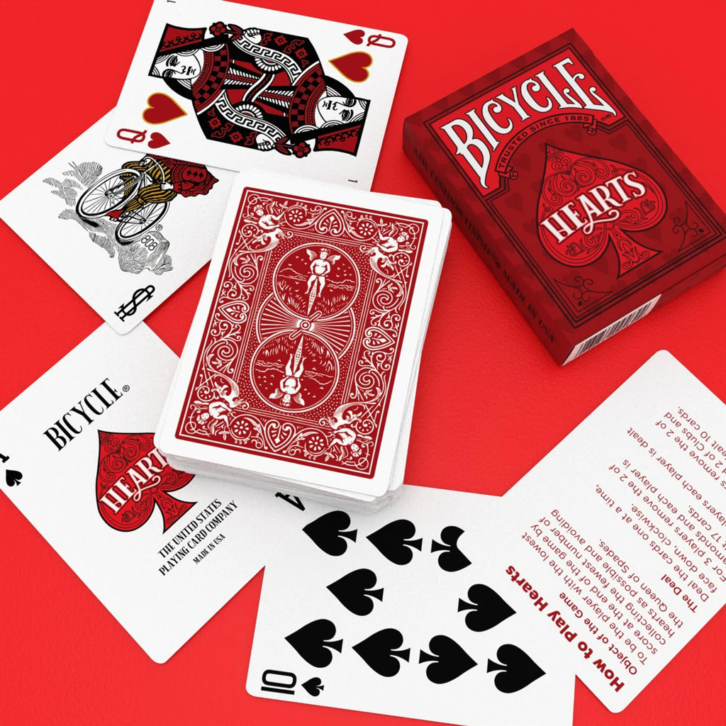 Celebrate the game of Hearts with the Bicycle Hearts Playing Cards deck, purpose-built for trick-taking fun and designed to help players master this classic game. Each deck prominently highlights heart cards with point values and features a specially marked Queen of Spades to help new and veteran players keep track of scoring twists and penalties. Printed on Bicycle’s renowned cardstock with Air-Cushion Finish, these cards deliver smooth shuffling, exceptional durability, and legendary performance that players expect from the world’s leading card brand.