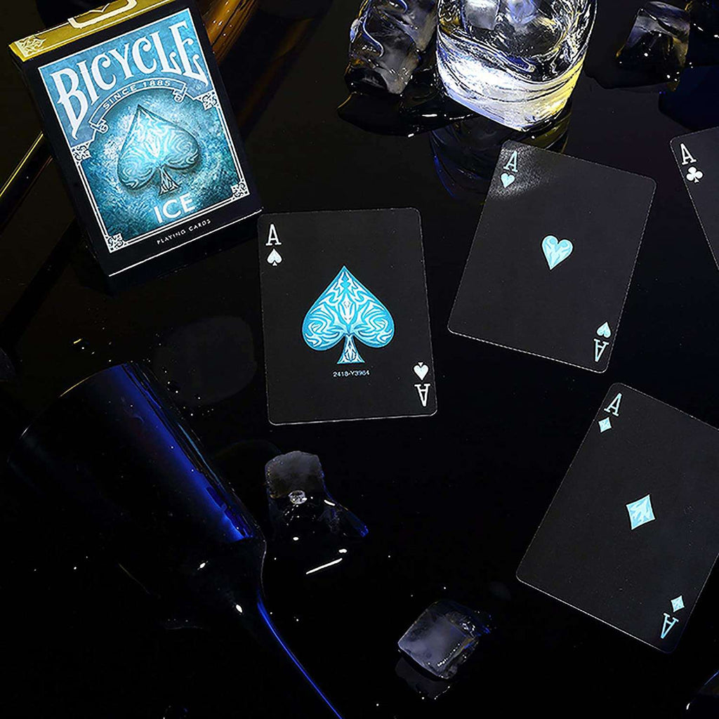 The Bicycle Ice deck brings winter's crystalline beauty to the card table through a striking cyan and black color scheme that evokes glacial ice, arctic frost, and the cold brilliance of snow under moonlight. Released in 2018 and printed by the United States Playing Card Company, this visually stunning deck transforms the familiar Rider Back design into a frozen landscape where every card glimmers with icy detail.