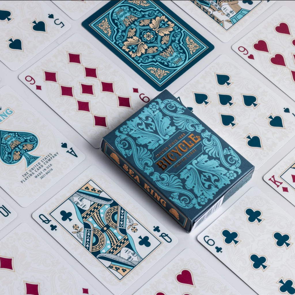 Dive into oceanic elegance with the Bicycle Sea King Playing Cards—a USPCC direct release that brings the majesty of the sea to life through richly detailed blues and teals, intricate wave patterns, and premium foiling that makes this deck truly fit for a king.