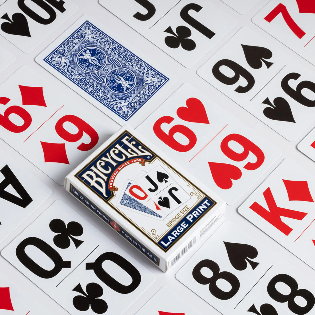 See every card clearly and play more comfortably with the Bicycle Bridge Large Print Rider Back deck, available individually in classic red or blue. These bridge‑size cards (2.25” × 3.5”) feature oversized, bold corner indices for easy reading across the table while keeping the familiar Bicycle 808 Rider Back design. Printed in the USA by USPCC with the signature Air‑Cushion Finish, they deliver smooth shuffles and long‑lasting durability—perfect for social and duplicate bridge, teaching tables, and low‑vision players.