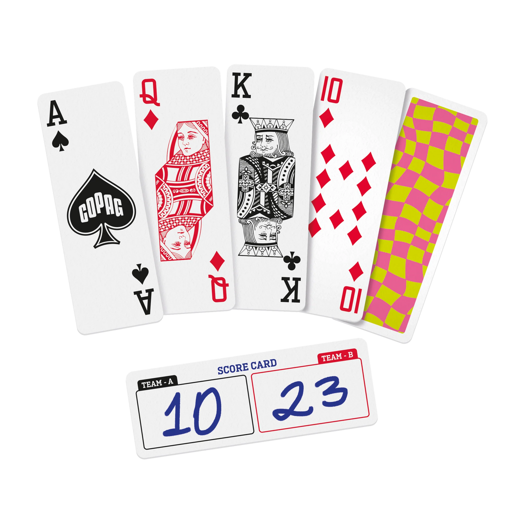 Each deck includes 52 standard playing cards, 2 Jokers, and a Copag guarantee card, packed in a slim paper tuck box that takes up minimal space in your luggage or game drawer. The regular‑index pips keep the faces familiar and readable while the narrow footprint and flexible plastic stock make the cards comfortable for kids and adults alike.