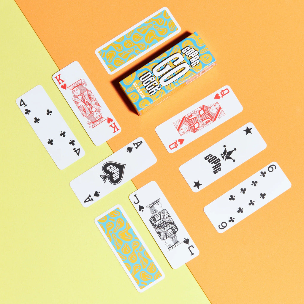 Each Smiles Go Deck includes 52 standard playing cards, 2 Jokers, and a Copag guarantee card, all packed in a narrow paper tuck box that’s just about 1" thick when closed. The regular‑index layout keeps pips clear and familiar, while the compact footprint and flexible plastic stock make the deck comfortable for both kids and adults.