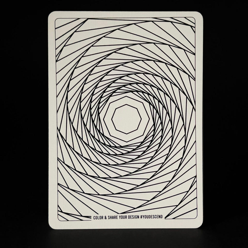 Each deck includes 52 fully playable cards, 2 jokers, and 2 ad/gaff cards featuring social links, a scripture reference, and a color‑your‑own spiral design that invites you to customize and share your own look. The tuck box continues the theme with a bold green arrow logo, hidden “LOOK UP” messages on the flaps, and clear crediting for Elijah and Thorsten, reinforcing this as a creator‑driven project rather than a generic custom deck. Printed on traditionally cut stock with an air‑cushion style finish, Descendents handles smoothly for shuffles, faros, and table work while still feeling soft enough for modern packet cuts and springs, making it a strong everyday worker that also stands out on camera.