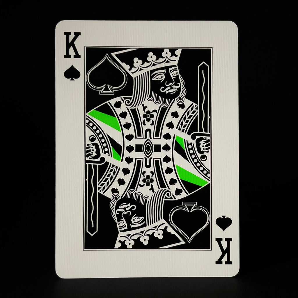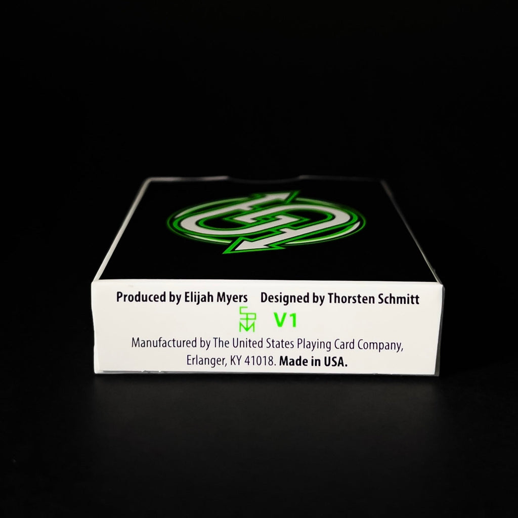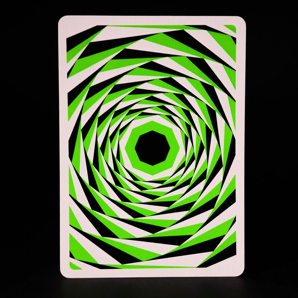 Descendents Playing Cards are a bold, neon‑green signature deck from magician and creator Elijah Myers (Card Perfect Magician), designed in collaboration with Thorsten Schmitt and printed in the USA by USPCC on classic crushed stock. The high‑contrast black, white, and electric green spiral back design explodes in fans, spreads, and flourishes, making this an ideal deck for both cardistry and visual magic. Custom faces mix minimalist one‑color neon courts with selectively accented black‑and‑green courts, a striking Ace of Spades, and themed jokers and ad cards built around the message, “No matter how far you descend, you can always look up,” giving the deck a clear narrative throughline.