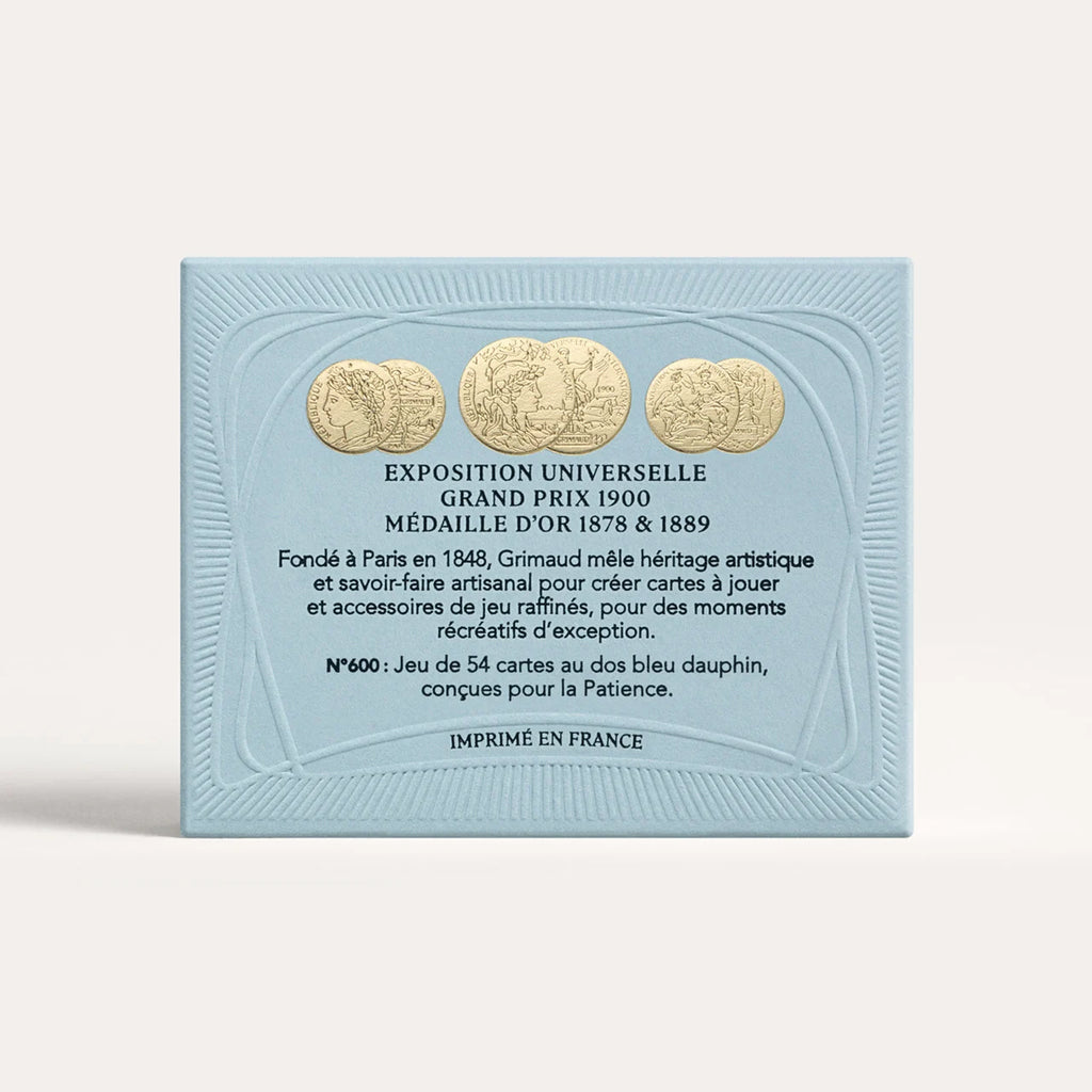 The Grimaud N°600 : Cartes de Patience (Dolphin Blue) is a luxury French solitaire deck that distills more than 175 years of Parisian card‑making into a compact, travel‑ready format. Designed expressly for Patience and other solitaire games, N°600 contains 54 miniature cards with English indices, each measuring approximately 61 × 70 mm (2.4 × 2.8 inches), with the signature Dolphin Blue card back—a refined geometric pattern drawn from Grimaud’s historic color palette.