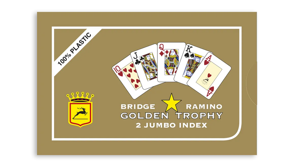 The Ramino Golden Trophy 2 Jumbo Index represents Modiano's commitment to creating cards that perform beautifully while providing exceptional visibility for players who appreciate larger indices. This 2-deck set is designed for Ramino, Burraco, Canasta, and other traditional multi-deck card games.