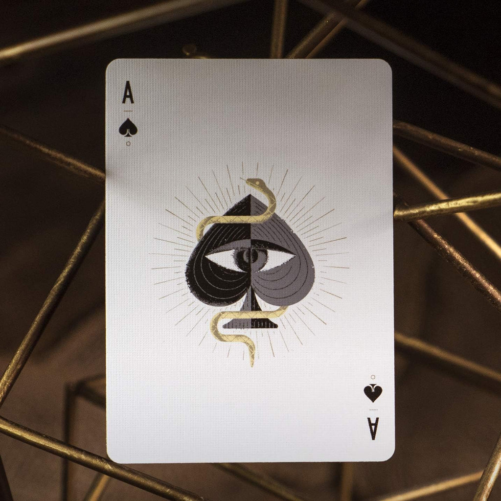 Aces are large and bold, each with their own unique gold design, while the faces and courts are slightly smaller than usual for an understated, elegant impression. The backs feature a harmonious blend of classic and modern, with a symmetrical design filled with hidden references to secret societies and arcane rituals. Two jokers and two gaff cards (perfect for magicians and collectors) complete the 56-card deck.